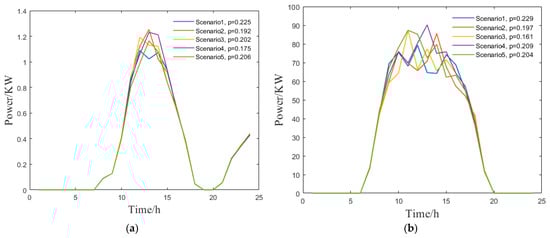 PV and WT output data scenario after K-means clustering reduction. (a) WT output; (b) PV output.