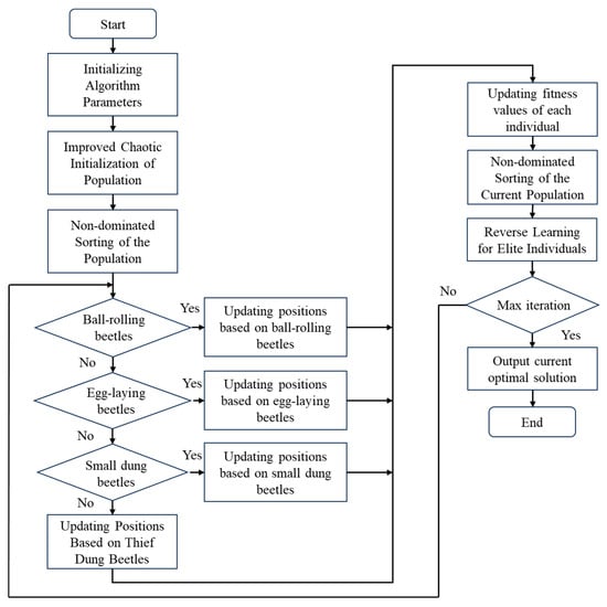The Dung Beetle Optimizer (DBO) is a new swarm bio-inspired algorithm introduced in 2022 []. It mimics the behavior of dung beetles, selecting random candidate solutions and simulating the best path for delivering food. The algorithm divides the beetles into four groups, each using different search strategies. By adding complexity to the search process, DBO reduces the impact of environmental changes on finding the best solution. Although DBO is relatively new, it has already been applied in many studies. Chen et al. [] used DBO for 3D path planning of drones, initializing the population with a chaotic strategy. Wei et al. [] utilized DBO to optimize the dimensions of ship hulls, achieving certain results by combining the algorithm with a random forest surrogate model. Alnafisah et al. [] established a financial futures prediction model, integrating deep learning with DBO. It is evident that DBO algorithm exhibits high versatility, showing good performance in path planning, industrial production and finance, etc. However, there is currently a significant gap in applying DBO for optimal scheduling in MG.
