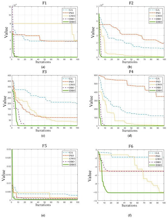 It can be seen that the IDBO significantly outperforms the GWO and DBO. Specifically, the initial value of IDBO is about 18.6% better than GWO and 5.5% better than DBO, enabling the algorithm to converge to the optimal value more quickly in fewer iterations. Non-dominated sorting allows for clearer evaluation and ranking of individuals within the population, which can improve convergence speed. As a result, IDBO reached the optimal range in fewer than 100 iterations. Additionally, the elite reverse learning strategy enhances convergence accuracy of IDBO in later iterations and improves the quality of the final value, which is about 56.6% better than GWO and 37.9% better than DBO. IDBO not only demonstrated a faster convergence speed, but also achieved higher solution accuracy and stronger local optima escape capability. These results fully demonstrate the significant advantages of the IDBO algorithm in terms of convergence, accuracy, and robustness.