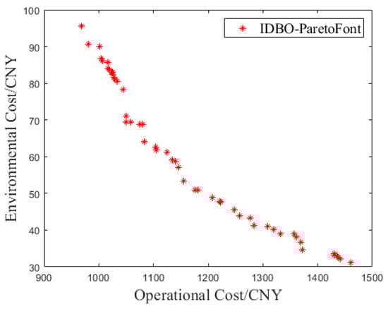 Figure 7 shows the Pareto front, illustrating a relationship between environmental costs and operational costs. As environmental costs decrease, operational costs rise; conversely, higher environmental costs correlate with lower operational costs. This relationship arises because lower environmental costs typically indicate greater reliance on RE. Whereas these energy sources are environmentally friendly, their operation costs are usually higher. In contrast, when an MG primarily relies on fossil fuels (such as gas and diesel), the fuel costs may be lower, but environmental costs significantly increase due to the large amount of pollutant emissions from the combustion of fossil fuel.