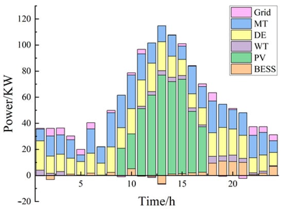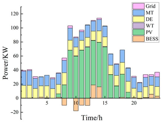 Figure 13 shows the output of the MG at the lowest total cost when considering DR and uncertainty of wind and solar power. Through the figure, it is proved that after the DR and uncertainty, the system’s scheduling strategy becomes more flexible and intelligent. It can dynamically adjust the operating mode based on the characteristics of different periods, thereby improving the system’s reliability and independence while ensuring economic efficiency. It can be seen that while the scheduling strategy of the MG remains consistent with Section 5.2, significant differences exist at the execution part. The most noticeable change is that the MG reduces its dependence on the grid, indicating that the system places greater use of DGs in the optimization scheduling process. By leveraging the DR and uncertainty, the MG is better able to coordinate its internal resources, reduce the need for electricity purchase from the grid, and, thereby, increase the system’s independence and self-sufficiency. Furthermore, the activity level of the BESS is significantly enhanced in the optimized scheduling, particularly notable at 8:00 a.m. At this time, the electricity price remains in the normal time, and the PV output is relatively abundant, so the BESS actively utilizes the PV output to charge. This strategy not only reduces charging costs but also improves the consumption of RE, avoiding the waste of solar energy. Simultaneously, the discharging behavior of the BESS during peak time further mitigates the power supply pressure on the system, achieving a peak load shifting.