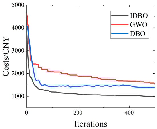 To further validate the performance of IDBO, GWO and DBO were selected for comparison with IDBO. The simulation experiments used an optimization step of 1 h, with a 24 h period as the optimization cycle. The minimum total cost was set as the objective function. The comparison of converge curves is shown in Figure 9.