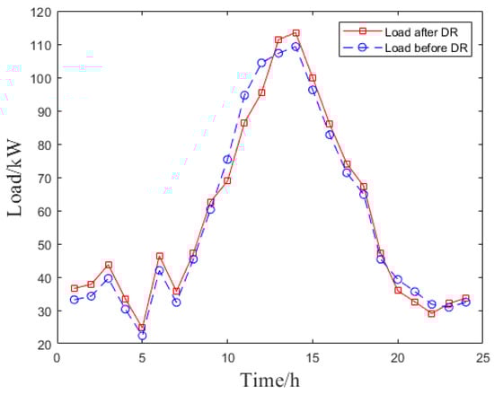 It can be observed from Figure 10 that after the DR, the distribution of load exhibits a pronounced optimization effect. Specifically, the load during the valley and normal time increases, whereas the load during the peak time significantly decreases. This change indicates that the DR effectively guides users to reduce electricity demand during peak time while encouraging increased consumption during valley time, thereby smoothing the load curve. This adjustment in load distribution not only helps alleviate the pressure on the grid during peak time, reducing over-reliance on DG units, but also enhances the overall operational efficiency and stability of the grid. Furthermore, through its peak load shifting, the DR promotes the rational allocation of electricity resources, reduces operational costs of the power system, and provides greater flexibility for the integration of renewable energy sources.