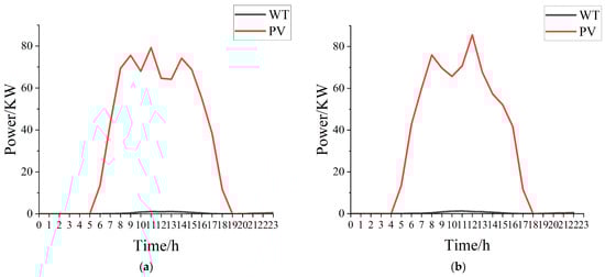 PV and WT output curve of simulated scenario. (a) WT output; (b) PV output.