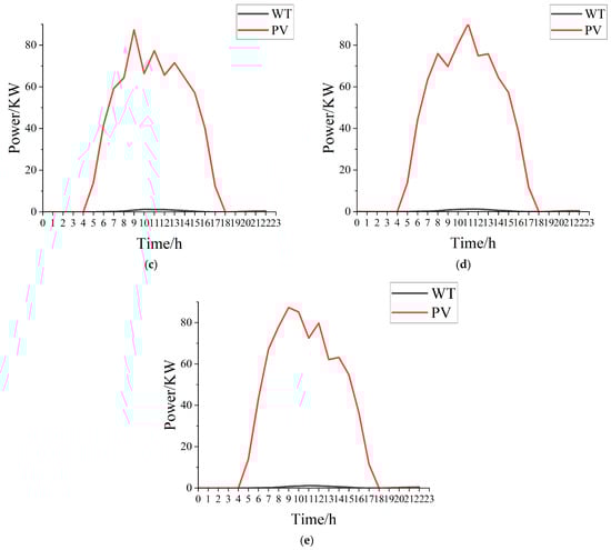 The WT output exhibits significant fluctuations, as wind power generation largely depends on wind speed. In the morning, when the wind speed is low, WT output is minimal, whereas during the evening and midnight, as wind speed increases, WT output increases.