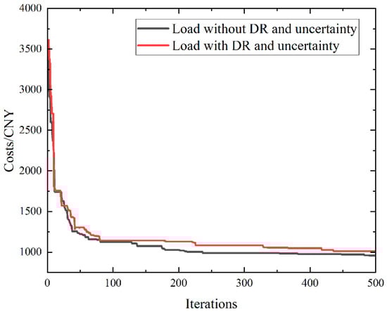 Figure 12 shows the comparison results of convergence curves considering DR and uncertainty, using IDBO for optimization. It can be seen that compared to the traditional scheduling model, which does not consider DR and uncertainty, this approach results in a significant reduction in the MG’s daily total cost by CNY 58.28. This substantial cost reduction is mainly attributed to the flexible adjustment of the load curve by the DR and the uncertainty factors. The DR incentivizes users to reduce electricity consumption during peak time and increase consumption during valley and normal time, achieving a peak load shifting, thereby reducing the operational pressure on the system. Meanwhile, the IDBO improves the system’s economy and reliability through precise prediction and optimization scheduling of wind–solar output fluctuations.