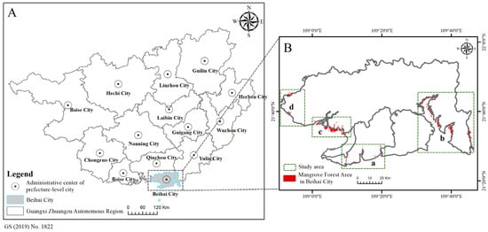 The geographic location of the study area. (A) The coastal area of Beihai City, Guangxi, China. (B) The study area (a. Coastal National Wetland Park of Beihai, Guangxi, and Hengluoshan area of Yinhai District, Beihai, Guangxi; b. Dugong and Shankou National Nature Reserve area of Hepu, Guangxi; c. the coastal area of Lianzhou Bay of Hepu, Beihai, Guangxi; and d. the coastal area of Maowei Sea and Dafeng River, Guangxi).