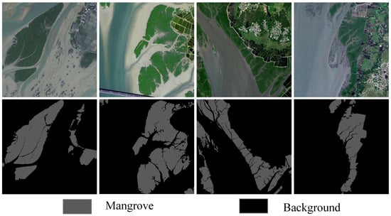 This study used the raster processing batch tool in ENVI 5.6 software to complete the preliminary processing steps, including radiometric calibration, atmospheric correction, and image cropping, followed by data annotation work. First, a multi-source data fusion strategy was adopted, combining high-resolution data from multiple satellites, including BJ-2, BJ-3, GF-7, SV-1, and JL-1, covering a time span from 2018 to 2022, with spatial resolutions ranging from 0.3 m to 0.8 m, which greatly reduced potential errors from single data sources. Secondly, regarding the standards for constructing and selecting image samples, we established strict screening criteria: cloud coverage in selected images was controlled below 10%, ensuring high image clarity without stripe noise and systematic distortion. Meanwhile, our study area comprehensively covers mangrove distribution areas in Beihai City, including typical ecosystems such as estuary regions, coastal zones, wetland protected areas, and wetland parks. Special attention was paid to collecting mangrove communities of different density levels, covering areas from sparse to dense growth while also considering various spatial distribution patterns, including continuous and scattered distributions. The implementation of these standards effectively ensured data reliability and accuracy. Finally, experts from geographical science and computer technology fields were brought in for collaborative annotation, combining GIS and remote sensing image interpretation techniques to enhance the professionalism and reliability of the annotations. Additionally, this study referenced historical data, particularly the Chinese Mangrove Long Time Series Satellite Remote Sensing Monitoring Dataset (1978–2018), ensuring the temporal continuity and spatial consistency of annotations. Figure 3 displays examples of the dataset’s original remote sensing images and their corresponding annotation results, visually demonstrating the precision and professional level of the annotations. Furthermore, this study employed measures such as iterative optimization, strict quality control processes, and temporal consistency checks to ensure the reliability of the annotation results. This comprehensive approach not only overcomes the limitations of traditional manual marking in terms of subjectivity, efficiency, and accuracy but also provides valuable experience and reference for large-scale mangrove monitoring and other remote sensing image annotation tasks.