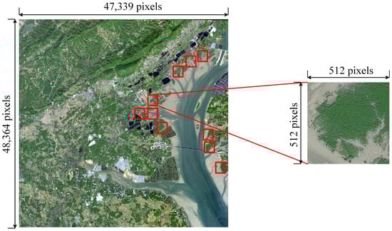 After annotation, this paper used a 512 × 512-pixel sliding window (i.e., moving steps in horizontal and vertical directions) to crop large-scale remote sensing images, as shown in Figure 4, ultimately constructing a dataset containing 2568 remote sensing images. To ensure scientific training and objective evaluation of the model, the entire dataset was divided in a 7:2:1 ratio into mutually independent sets of 1798 training images, 514 validation images, and 256 test images. Firstly, this method satisfies the input requirements of deep learning models (which automatically learn features and patterns in data through multi-layer neural networks), as remote sensing images are typically too large to be directly input into standard memory deep convolutional neural network models. The 512 × 512-pixel window size maintains a sufficient spatial resolution to capture target features while enabling efficient training and inference under existing hardware conditions. Secondly, this cropping method helps optimize computational resources by processing large-scale remote sensing images in batches, reducing resource requirements for single computations and improving computational efficiency and parallel processing capabilities. Furthermore, the 512 × 512 window size preserves local spatial details while covering sufficient ground feature information, helping models better learn and recognize complex ground features such as mangrove distribution and morphology. By cropping different image blocks and combining sliding window overlap settings, more diverse training samples can be generated. Smaller image blocks are also more conducive to data augmentation operations, helping improve model generalization ability and reduce overfitting risk. Setting overlap regions ensures the preservation of boundary details when recombining image blocks, which is particularly important for maintaining spatial continuity and improving overall classification or detection accuracy. Finally, processing smaller image blocks helps better manage computer memory and avoid memory overflow issues. In conclusion, this cropping method not only meets the technical requirements of deep learning models but also ensures image information integrity while improving processing efficiency and model performance, holding significant importance for large-scale remote sensing image analysis and mangrove monitoring.