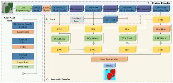This study selects ConvNeXt as the feature encoder. As a significant breakthrough in the visual field in recent years, ConvNeXt maintains the efficient computation of convolutional neural networks while integrating the advantageous design elements of Transformer [37]. It possesses powerful feature extraction capabilities and an optimized network architecture, characteristics particularly suitable for processing complex features in mangrove remote sensing images. The specific structure is shown in Figure 6.