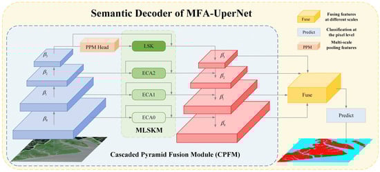 The semantic decoder is a key component of MFA-UperNet, primarily consisting of the Cascade Pyramid Fusion Module (CPFM) and Multi-scale Selective Kernel Attention Module (MSKAM). The collaborative work of these two modules achieves an effective fusion of multi-scale features and adaptive enhancement of key information. The overall structure is shown in Figure 7.