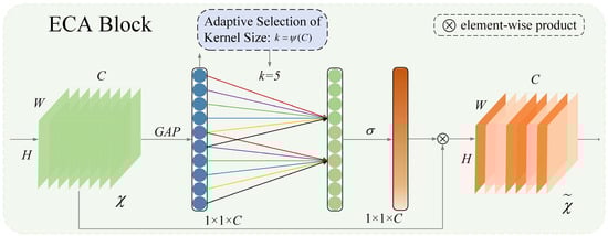 Specifically, for an input feature map , with dimensions C × H × W (channels × height × width), the ECA attention mechanism processing flow is as follows. First, through Global Average Pooling (GAP), the features are compressed into a 1 × 1 × C vector, achieving global spatial information aggregation for each channel. Then, the module adaptively determines the size of the one-dimensional convolution kernel (5 in this paper) based on the number of channels C, used to control the range of local cross-channel interactions. Channel-wise local information interaction is achieved through one-dimensional convolution operations, a design that obtains channel dependencies without dimensionality reduction. Finally, channel attention weights are generated and interacted with the original feature map, with the calculation process shown in Formula (3):
