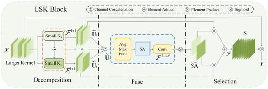 Specifically, the design of the LSK module encompasses three core phases: decomposition, fusion, and selection. During the decomposition phase, large-receptive-field convolution operations are decomposed into multiple small-sized convolution kernels with different dilation rates. This design maintains the original overall receptive field range while providing the network with multiple receptive field options at different scales. The kernel size , dilation rate , and receptive field expansion of the i-th convolution are defined as shown in Equations (4) and (5):