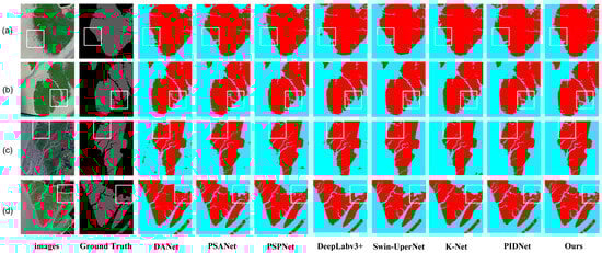 A plot of the segmentation results of different models on the MSSDBG dataset. (White boxes are used to highlight the differences in the results under different methods.)