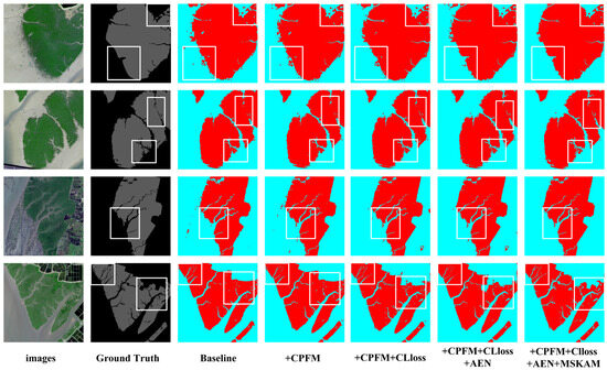 In the baseline method, the model showed notable limitations in mangrove identification, exhibiting misclassification phenomena and obvious blurring effects in boundary regions. After introducing CPFM, due to its effective fusion of multi-scale feature information, the model’s overall segmentation performance improved significantly, with notably reduced misclassification areas, although some inaccuracies in boundary processing remained. Following the addition of CLloss, through the optimization of mixed loss functions, the model demonstrated better performance in handling sample imbalance issues and improved boundary region segmentation accuracy, though the capture of detailed features in complex scenarios still needed improvement. With the further introduction of the AEN module, the model’s ability to recognize edge regions was enhanced with clearer boundary contours, but some difficulties remained in processing small-target mangroves. Finally, after incorporating MSKAM, the model’s performance reached its optimal state. Through the synergistic effect of ECA and LSK modules, feature extraction became more precise and spatial information acquisition more comprehensive, enabling the model to better handle targets of different scales, particularly achieving significant improvements in small target recognition and boundary detail processing in complex backgrounds. The segmentation results became more refined, boundaries clearer, and misclassification phenomena substantially reduced, fully validating the effectiveness and synergy of each module proposed in this paper.