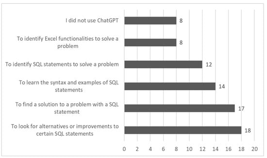 Furthermore, it is interesting to explore the specific usage of ChatGPT to solve database administration problems (see Figure 1): 80% of the students declared that they used this tool and used it mainly to look for alternatives or improvements to certain SQL statements, to solve problems with a SQL statement, and to know about the syntax or examples of certain SQL statements. For example, ChatGPT proved to be quite useful for students who wanted to learn details about SQL statements for creating users or granting permissions but it was not very useful to identify the SQL statements necessary to load information in a MySQL database from an MS Excel or an XML file or to solve problems during the loading process, such as incompatibility between the character set of the data. In these cases, the solution usually came from a Socratic question of the teacher, a targeted instruction from a classmate, or other traditional sources.