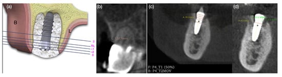 A cone beam computed tomography (CBCT) scan was performed using buccal retractors to isolate the soft tissue contours, with a field of view (FOV) of 7 × 15 cm, a 0.3 mm voxel size, and a resolution of 0.5 mm (scan time: 20 s, 14 bits grayscale) using an i-CAT Classic (Imaging Sciences International, Inc., Hatfield, PA, USA). The CBCTs were performed before tooth extraction, after the implant surgery (T1) and 4 months (T2) post-implant placement. To align the original DICOM data from the T1 and T2 CBCTs scans, a superimposition was performed following the methodology previously described in the literature [21], by the OnDemand3D software (Version 1.0.9.3223, CyberMed Inc., Seoul, Republic of Korea) and transformed into the (.gipl) format using the ITK-SNAP software (version 3.6.0, www.itksnap.org, accessed on 30 September 2020) to enable proper superimposition in the Slicer software (version 5.0.2, www.slicer.org, 30 September 2020). The linear measurements were made using the same reference points, in which the vertical and horizontal measurements followed the parallelism of a perpendicular line drawn on the implant. A horizontal reference line (RL) was determined at the implant platform with the smooth/rough surface junction [3]. A single-blinded and calibrated examiner performed all the measurements (Figure 1). Horizontal width hard tissue alteration changes between the T1 and T2 of the lingual/palatal and buccal bone wall (HBT) at five levels were measured: the RL and at 0 mm, −1 mm, and −2 mm above the RL; and 2 mm below the RL. The buccal and lingual bone level changes were determined by variation on vertical bone height between baseline (T1) and 4 months (T2) after implant placement (ΔVBH T1-T2). The buccal vertical soft tissue thickness was measured prior to tooth extraction using a CBCT scan. One of the major advantages of using a 3D Slicer is the ability to achieve transparency between T1 and T2 slices, allowing the same reference marking, traced only once, to be reproduced consistently across both analysis time points.