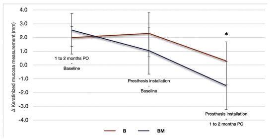 Changes in the width of keratinized mucosa expressed in mm (n = 28). ∆ represents the net change in keratinized mucosa at different evaluation times: preoperative (baseline), after 1–2 months post-implant placement, and after the emergence contour of a provisional prosthesis. * indicate p < 0.05.