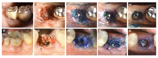 Wound healing phases in sequence: (a,f) before tooth extraction, (b,g) immediately after implant placement, (c,h) 2 days postoperatively (PO), (d,i) 7 days PO, and (e,j) 30 days PO. a-e represents the Bio-Oss + Mucograft treatment group (BM), while (f–j) represents the Bio-Oss treatment group (B).