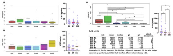 Levels of cytokines and growth factors. Molecules were measured by a Luminex assay in patients after implant placement. (a) FGF-2; (b) VEGF; (c) IL1-β. Abbreviation: B, Bio-Oss treatment; BM, Bio-Oss + Mucograft treatment; D: day after implant placement. * indicate p < 0.05.