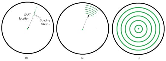 SART image on the radar screen depending on the distance from the vessel. (a) Distance of 5–6 Nm, radar range 12 Nm; (b) Distance of 2–3 Nm, radar range 6 Nm; (c) Distance < 1 Nm, radar range 6 Nm.