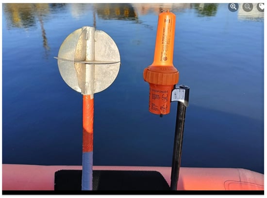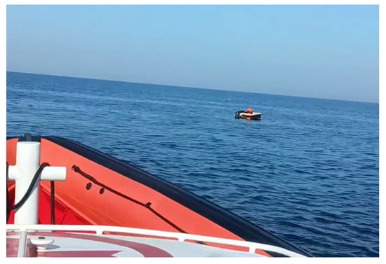 The research was conducted in the Bay of Pomerania in the Baltic Sea (Figure 4) in 2024, at geographic coordinates φ = 54°36.8′ N; λ = 14°41.6′ E. The search target was a liferaft equipped with a S4 Rescue SART device (McMurdo Portsmouth, UK). The SART device was positioned 1.5 m above the sea surface. A 15-m-long vessel equipped with an X-band Raymarine radar was used for the survey. The radar antenna was mounted at a height of 6 m above the sea surface, while the observer’s eyes were positioned at a height of 3 m. The vessel used in the experiment is a search and rescue type, actively engaged in daily service. This medium-sized vessel is primarily designed for search operations, survivor recovery, casualty transport, and towing. It is optimally equipped for effective operations, particularly for search activities. The antenna height is not significant and differs from that of typical cargo or passenger vessels, which may affect the reception of the SART response signal.