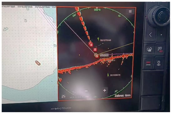 For illustrative purposes, sample photos of the radar screen are shown in Figure 8, Figure 9, Figure 10 and Figure 11. Figure 8 shows the radar image after detecting the SART device at a distance of 2 Nm. The photograph is divided into two parts: the left part shows the electronic chart, while the right part displays the radar image. The current radar settings are manual, with a radar range of 6 Nm. The ship is located at the center of the radar image, which is oriented towards the north. The bow of the ship is pointing towards 316°. To the south of the ship, an echo from the shoreline is visible, extending from east to west. The echoes from the objects are marked with diamonds.