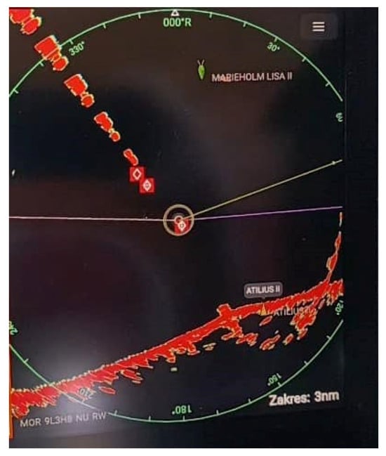 At distances of 3, 2, and 1 Nm, a signal was also received, and the liferaft echo was visible. Both parameters received positive assessments (A1 = 1; A2 = 1). The SART response signal appeared as stretched echoes, but they did not form arcs. Such a response signal from the SART device is recognizable to the radar operator and indicates detection of the device, but it is not entirely consistent with the theoretical appearance of the echo. For this reason, this parameter was assessed negatively (A3 = 0). The intensity of the interference was assessed as weak (A4 = 0).