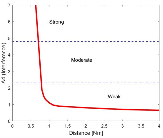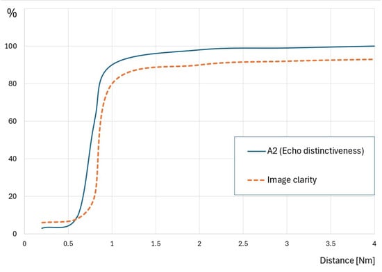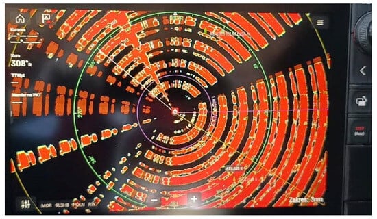 In this way, the effectiveness of two parameters, A1 and A2, will be determined. The effectiveness of the shape will be calculated as the arithmetic average of the three detection ranges (Formulas (2) and (3)). According to the SART user manual, at distances of 5–6 Nm, the navigator should observe dots; at distances of 2–3 Nm, the navigator should observe arcs; and at distances of less than 1 Nm, the navigator should observe concentric circles. These expected signal shapes will be studied in the following ranges: 4 Nm and greater, 1–3 Nm, and less than 1 Nm. The amount of interference (A4) will be evaluated separately as a function of the relationship between the level of interference and the distance and will be shown in the graph.