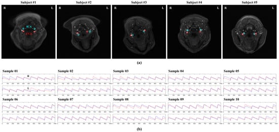 Ground truth samples used in the simulation. (a) The regions of interest (ROIs) in the internal and common carotid arteries (ICA and CCA, respectively) were extracted from time-of-flight magnetic resonance angiography using simultaneous multislice images from five patients. (b) Two different pulse waveforms were applied to each ROI for simulation, resulting in a total of 10 waveforms. The time series for the left and right hemispheres of each sample were plotted, and the blue and red lines represent the time series of ICA and CCA, respectively.