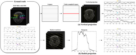 By contrast, the vertical projection method is prone to significant signal interference between major vessels. In such cases, temporal noise from the primary vessel is also affected by temporal noise from other large vessels, thereby amplifying the overall signal interference. This persistent interference results in consistently high MAE values, irrespective of the temporal noise levels, indicating that the vertical projection method should have sufficient k-space sampling lines. The radial projection method was shown to be more effective than the vertical projection method, as its performance was stable even at various temporal noise levels, suggesting its potential as an important tool for early diagnosis and treatment evaluation in cerebrovascular diseases.
