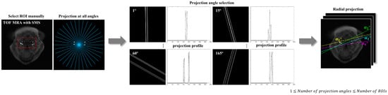 Method for selecting the projection angles in the radial projection method. Templates with the time series of the internal and common carotid arteries are constructed from the ground truth image (red dashed box). These templates are then Radon transformed across all angles from 1° to 180°. The resulting sinograms for each angle are used to select the optimal projection angles to avoid signal interference between vessels. The number of selected projection angles can range from a minimum of one to a maximum equivalent to the number of ROIs. Note that each angle line in the right panel shows the selected vessel being isolated, not the center of the image. TOF MRA, time-of-flight magnetic resonance angiography; SMS, simultaneous multislice; ROI, region of interest.