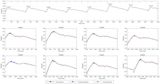 Comparison of time series and peak points among the simulation, undersampled, and interpolated datasets. The top panel shows the time series from the simulation dataset over the range of 0–4800 ms. The bottom two panels provide detailed views of the eight waveform peaks (Peak 01 to Peak 08). The black, blue, and red arrowheads indicate the peak points for the simulation, undersampled, and interpolated datasets, respectively. The interpolated dataset closely followed the simulation dataset, indicating effective reconstruction of the original signal. Although the undersampled dataset showed a similar trend to the time series of the simulation dataset, there were noticeable differences in the peak positions.