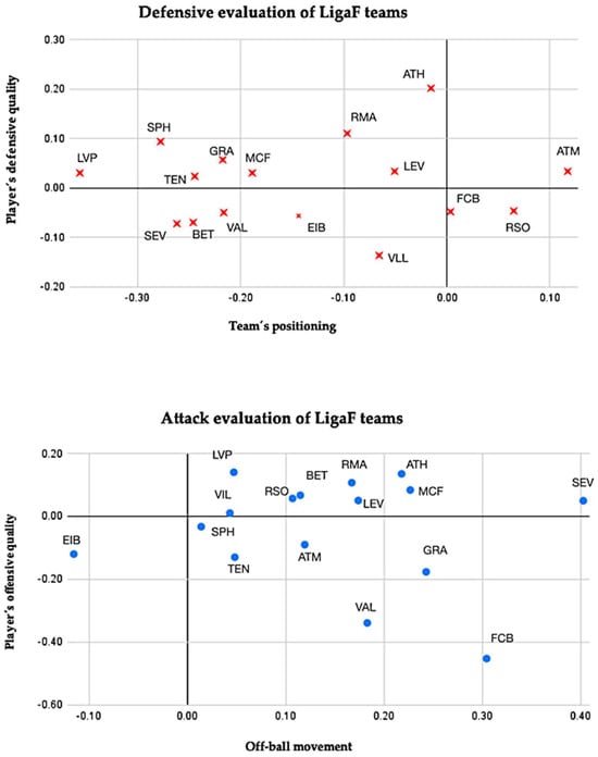 A detailed analysis of the teams allows the authors to raise the following reflections: In LigaF, Sevilla FC (SEV) recorded the lowest scores for both team’s positioning and player’s defensive quality, indicating poor defensive organization and limited ability of defenders to prevent goal-scoring opportunities. Coaches should focus on improving both the overall defensive structure and the individual skills of defenders to better prevent shots on goal. Conversely, Barcelona FC (FBC) achieved a high score for off-ball movement but a low score for player’s offensive quality, suggesting that the team creates numerous goal-scoring opportunities but struggles to convert them into goals. Coaches should prioritize enhancing the shooting skills of shooters.