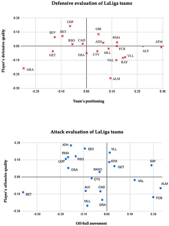 Figure 1 and Figure 2 establish the relationship of off-ball movement and player’s offensive quality and team’s positioning and player’s defensive quality for all teams in the women’s and men’s leagues, respectively. From these figures, the strengths and weaknesses of each team can be identified, whether in the defensive or attack phase, at any given point in time or at the conclusion of the season, as demonstrated in this study. In the defensive evaluation figures, the x-coordinate represents the team’s positioning, while the y-coordinate represents the player’s defensive quality. Therefore, a team’s position further to the right on the x-coordinate indicates better team’s positioning, while a position further to the left reflects a lower positioning value. On the y-coordinate, an upward shift corresponds to higher player defensive quality, whereas a downward shift indicates lower player defensive quality. In the attack evaluation figures, the x-coordinate represents the off-ball movement, while the y-coordinate represents the player’s offensive quality. Thus, greater off-ball movement is indicated by a position further to the right on the x-axis, whereas a position further to the left reflects lower off-ball movement. On the y-axis, an upward shift corresponds to higher player offensive quality, whereas a downward shift indicates lower player offensive quality.