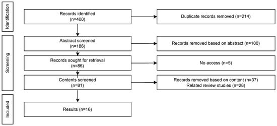 PRISMA flowchart illustrating the number of papers through different phases of the review process. The related review studies that were identified in the contents screening phase are listed in the related studies section of this paper.