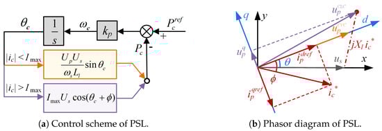 The GSC employs Power Synchronization Loop (PSL) control, as depicted in Figure 2a. The dynamic of the GSC is governed by the change in the converter angle  and its frequency  relative to the grid frequency
