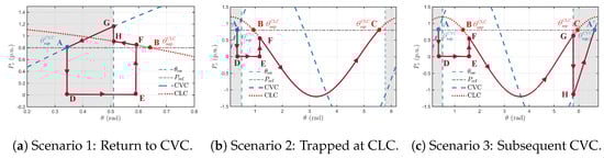 As illustrated in Figure 3c, this occurs when the choice of  positions the CLC’s SEP (point C) in the CVC area such that the post-fault trajectory re-enters the CVC operating region along the path G-H, bypassing the CLC trap. It crosses the UEP  (point B) and switches to a subsequent CVC mode (G → H), finally settling at  (point A′).