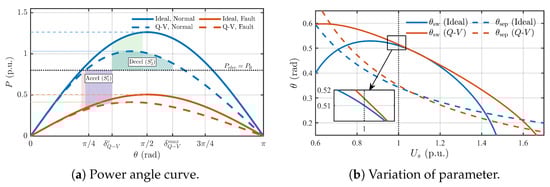 This coupling alters the power-angle curve, as shown in Figure 4a. The active Q-V droop (dashed line) reduces the peak power transfer capability compared to the ideal case (solid line), thereby shrinking the system’s stability margin. The SEP in CVC mode, , is shifted to the right, as it is the solution to .