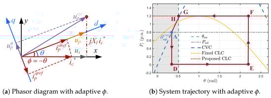 With , the GSC active power in CLC mode  becomes , which represents the maximum active power transferable to the grid under the current limit , aligning the current vector with the grid voltage . This alignment is depicted in the phasor diagram in Figure 5a, where setting  forces the current vector  to align with the grid voltage , maximizing active power injection. The impact on the system’s power-angle characteristics is illustrated in Figure 5b. The power curve in CLC mode becomes a horizontal line at . Since this line does not intersect the power reference , assuming , the detrimental SEPs and UEPs of fixed-angle CLC are eliminated. Consequently, the post-fault system trajectory is guided back to the CVC operating region, ensuring a predictable and stable return to the original SEP and preventing the system from being trapped in CLC mode.