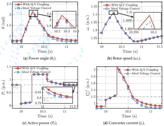 To validate the theoretical analysis of reactive power coupling, a three-phase fault is applied at the PCC at  s and cleared after 200 ms. Figure 7 compares the system’s dynamic response under ideal voltage control against the case with Q-V droop coupling. As shown in Figure 7a, with Q-V coupling active, the power angle  exhibits a larger peak overshoot and more pronounced post-fault oscillations. This confirms that reactive power coupling reduces the synchronizing torque, as analyzed in Section 3. Consequently, the rotor speed  reaches a higher peak, as shown in Figure 7b, and the active power  recovery is more oscillatory, as seen in Figure 7c. The converter current  hits the limit  in both scenarios, but the system with Q-V coupling shows a slower recovery from saturation, as depicted in Figure 7d. These results validate that the reactive power control loop can degrade transient stability by weakening the system’s ability to resynchronize after a disturbance.