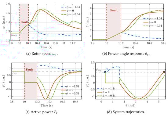 where  is the rotor speed at fault clearance , typically the peak if the system recovers to its original SEP,  is the mechanical power, and  is the GSC active power output under fault voltage . With the proposed adaptive , the GSC fault power derived from Equation (30) is greater than conventional CLC with a fixed angle  from Equation (27)