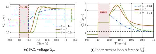 In this mode, the GSC acts as a current source, and the saturated current vector is thus set to , as illustrated in the phasor diagram in Figure 2b. Further, according to Kirchhoff’s voltage law of the circuit, considering the relationship between PCC voltage, grid voltage, and line voltage drop, the PCC voltage  is
