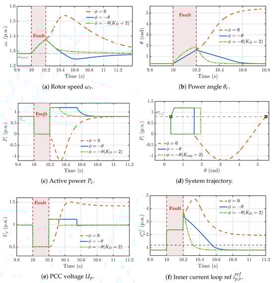 The performance of the proposed adaptive control strategy is evaluated under the same fault condition, using the controller gains (, ) specified in Table 1. Figure 9 compares the system response for the following three cases: (1) conventional CLC with a fixed angle , (2) the proposed adaptive angle  without damping enhancement, and (3) the full proposed strategy with adaptive angle and damping enhancement (). For this comparison, a damping gain of  was selected, as it provides a strong balance between fast recovery and first-swing overshoot, a trade-off explored further in Section 5.3.