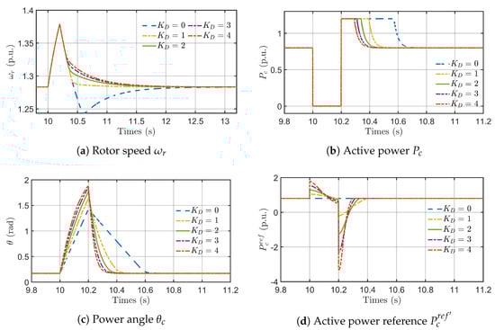 Finally, to validate the adaptive damping law and investigate the system’s sensitivity to the gain , a parameter scan was performed. The results, presented in Figure 10, reveal a critical trade-off inherent in the control design. As  increases, the adaptive control provides a more aggressive restoring force, which significantly reduces oscillation settling time in rotor speed, active power, and power angle, as shown in Figure 10a, Figure 10b and Figure 10c respectively. However, this improved damping comes at the cost of a larger initial power angle overshoot (PPA). For instance, increasing  from 0 to 4 raises the peak angle but progressively suppresses post-fault oscillations.