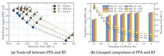 Table 3 quantifies this trade-off by comparing several Key Performance Indicators (KPIs). As the damping gain  increases, the Peak Power Angle (PPA) also increases, indicating a larger first swing. Conversely, the recovery time (RT) and the Integral of Absolute Error (IAE) generally decrease, signifying improved damping and faster settling. For instance, increasing  from 0 to 2 reduces the RT by over 62% to its minimum value of 0.174 s, but at the cost of a 24% increase in PPA. Further increasing  to 4.00 continues to reduce the IAE to its minimum, but the RT slightly increases, indicating that an overly aggressive gain can degrade some aspects of the recovery. This trend reveals a critical design trade-off that guides the tuning of the damping gain . Figure 11a shows that as the damping gain  increases, the RT decreases while the PPA increases, illustrating a clear trade-off. Figure 11b provides a grouped comparison, confirming that for various line reactances , a higher  consistently leads to a larger PPA and a shorter RT. The parameter scan was conducted under varying grid strengths ( = 0.2, 0.25, and 0.3 p.u.) to ensure the controller’s robustness. As shown in Figure 11, while weaker grids with higher  naturally lead to larger Peak Power Angles and longer recovery times, the proposed adaptive damping strategy consistently improves performance and ensures stability across all tested conditions. This confirms the controller’s effectiveness over a range of grid impedances.