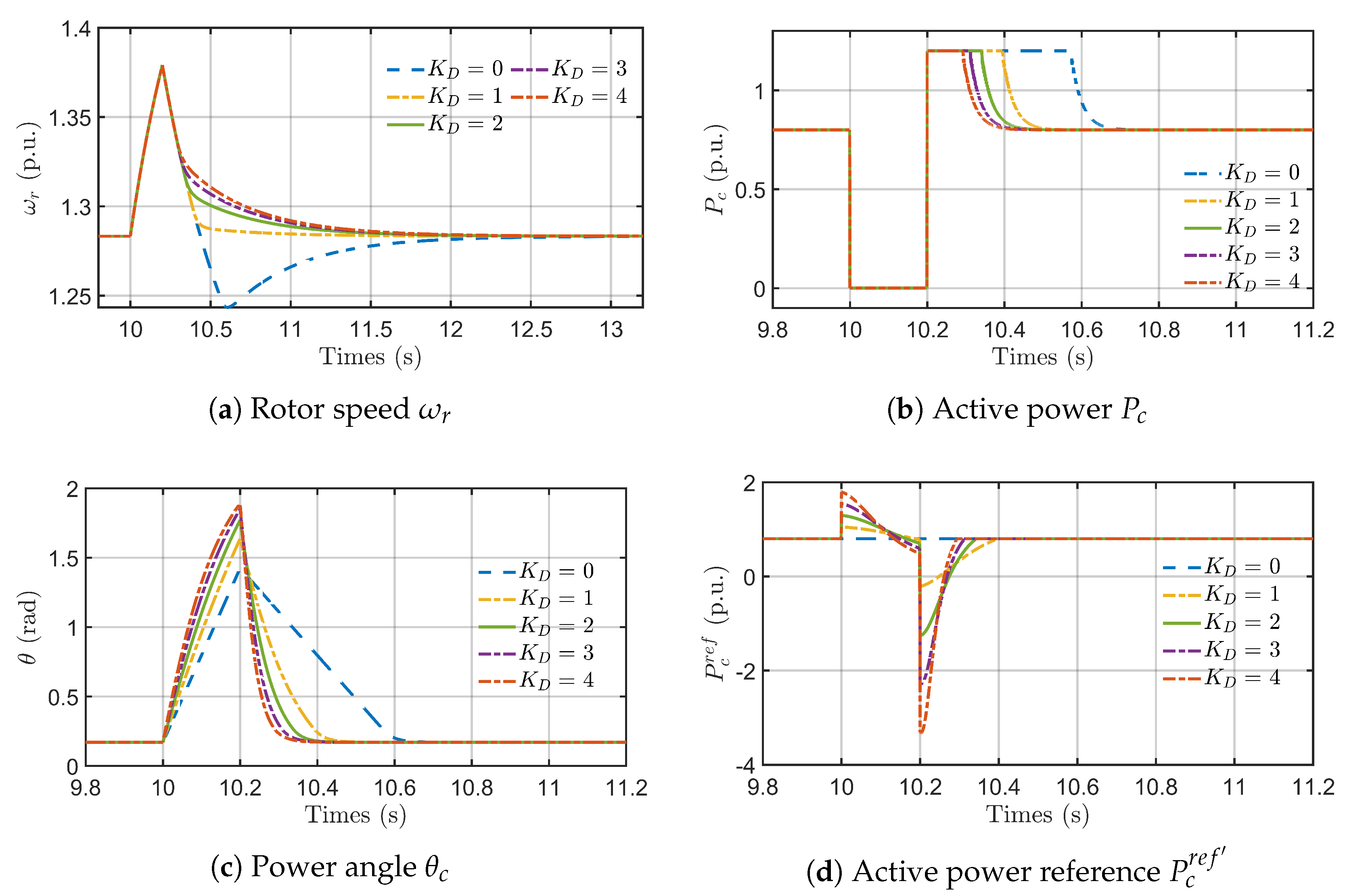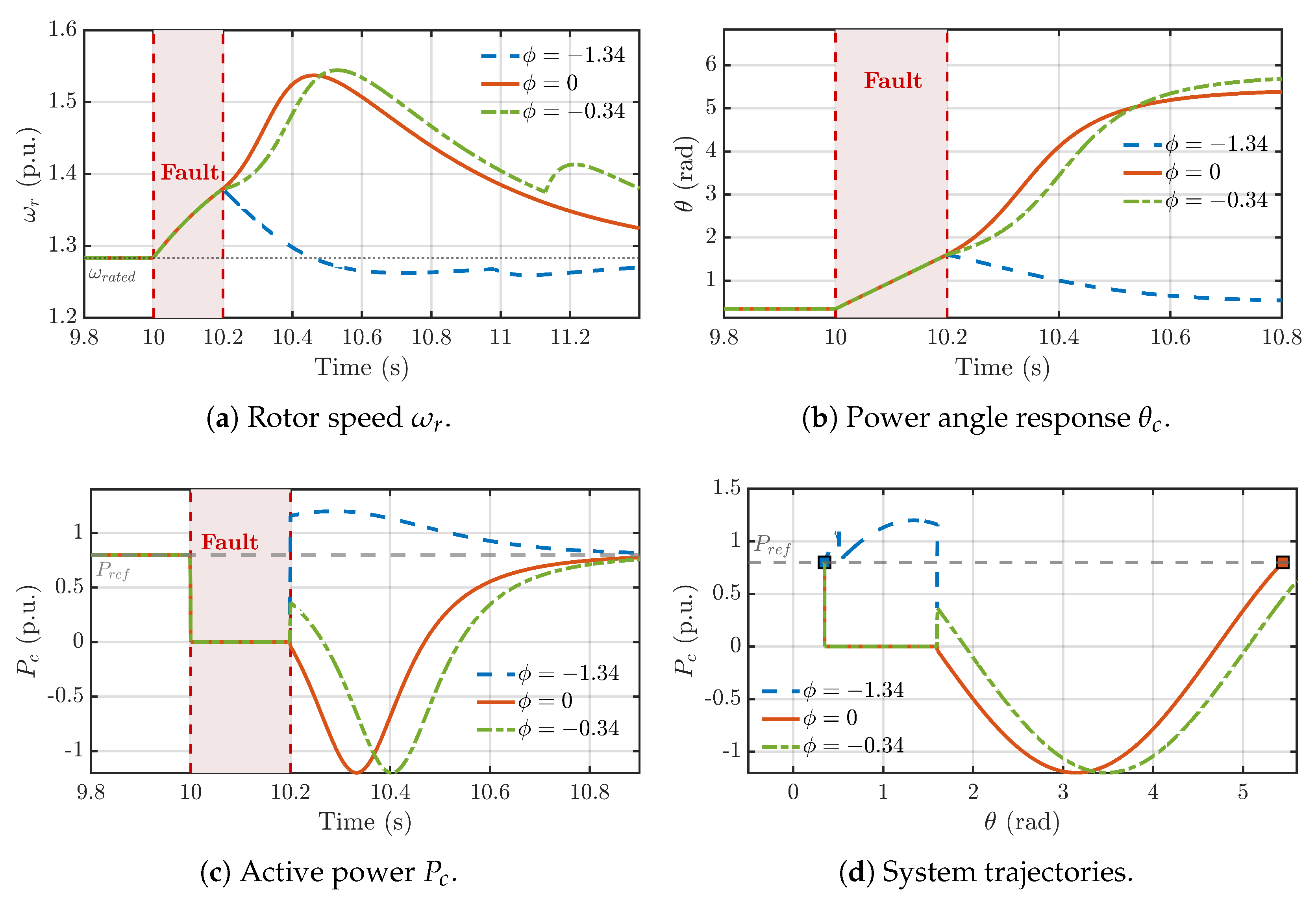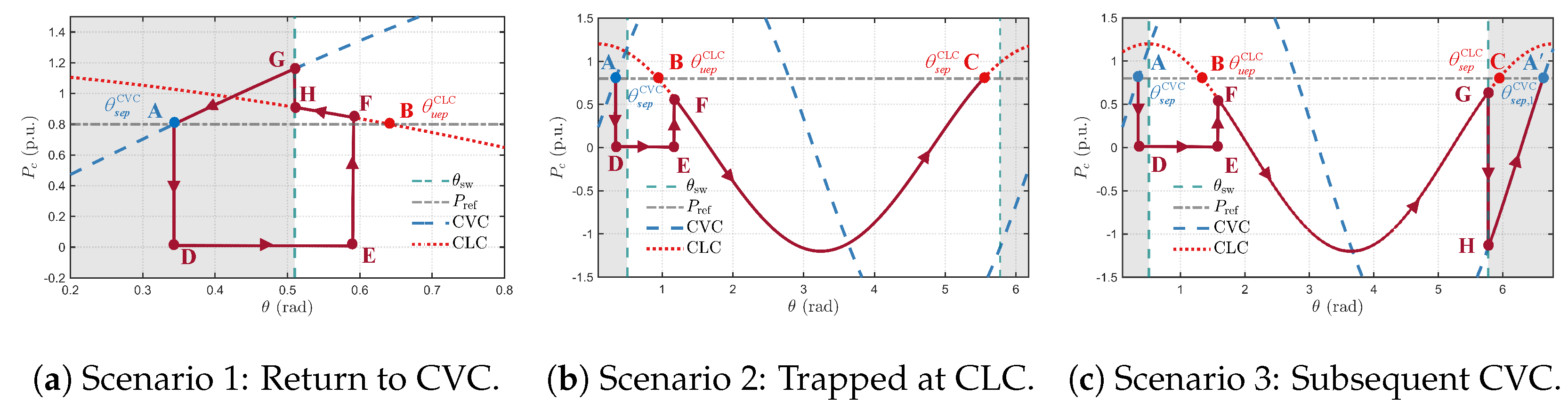 - Scenario 2 (Trapped in CLC, rad): When is outside the safe range, the system becomes trapped at the CLC’s SEP. The trajectory plot (d) shows the system stabilizing on the CLC power curve. This creates a sustained energy imbalance, causing the rotor speed (a) to accelerate continuously until an overspeed trip would occur.