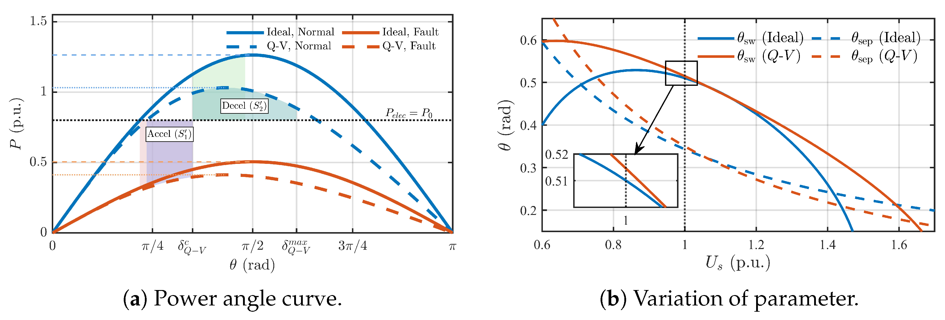 - Scenario 1 (Stable Recovery, rad): This angle lies within the safe operating range. As seen in the plots, after the fault is cleared, the rotor speed () peaks and then safely returns to its nominal value, while the power angle () successfully re-synchronizes to its original stable equilibrium point (SEP).