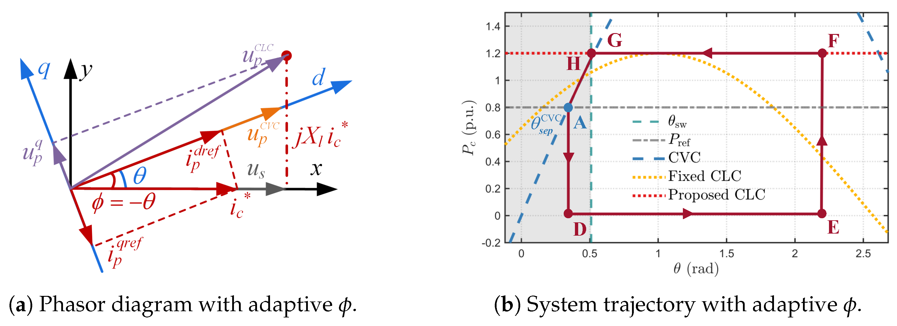 - A dual-mechanism enhancement strategy is proposed. This strategy integrates an adaptive saturated current angle to eliminate detrimental CLC equilibrium points with a damping controller that ensures robust electro-mechanical stability, addressing synchronization [28,29] and mechanical damping [34] in a unified manner.