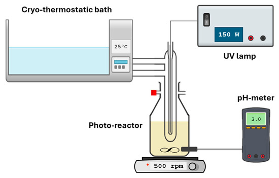 2) at an initial concentration of 50.0 mg/L. This concentration was selected to provide sufficient analytical resolution and reproducibility in the kinetic measurements, ensuring that the reaction could be monitored with minimal signal-to-noise interference. Although it is higher than typical environmental levels, the purpose of this study was not to replicate a specific real-life scenario but to generate fundamental insights into the mechanistic and operational aspects of the process under controlled laboratory conditions. Next, the pH of the solution was adjusted to 3.0 using 0.1 M hydrochloric acid (Panreac, Castellar del Vallès, Spain; HCl, 37%
